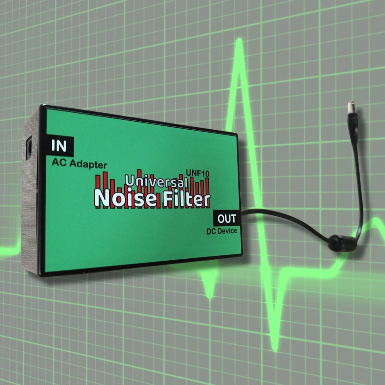 ケイ・ミズモリが商品化した「ユニバーサル・ノイズフィルターUNF10」は、2つのチョークコイルに計13個のコンデンサ、そしてフェライトコアを使用して、ACアダプター特有のスイッチングノイズだけでなく、コンセントから電源をとる機器には付き物のリップルノイズを大幅に低減させます。
