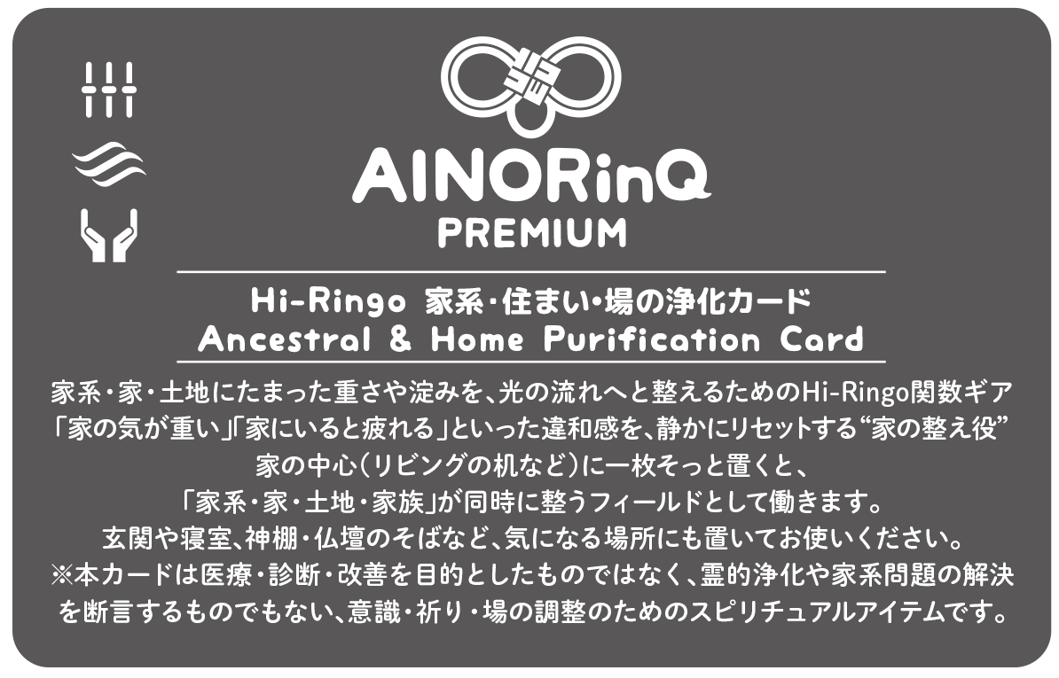 AINORIが「自分の内側を調和に戻す」ことに重心があるのに対して、AINORinQは、その内側の調和を起点に、外側(人・場・流れ)へもリンクさせ、つながり全体を整えていく“進化版”の位置づけです。