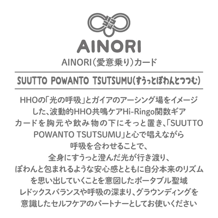 カードを胸元や飲み物の下にそっと置き、「SUUTTO POWANTO TSUTSUMU」と心で唱えながら呼吸を合わせることで、全身にすうっと澄んだ光が行き渡り、ぽわんと包まれるような安心感とともに自分本来のリズムを思い出していくことを意図したポータブル聖域です。